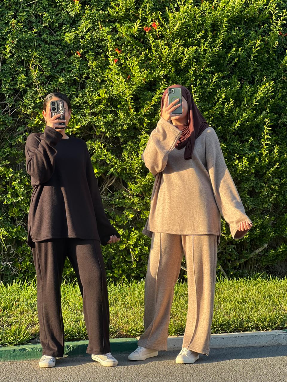 اكتشفي الطقم النسائي العصري والمريح المصنوع من قماش سوفا فيكوز المعروف بنعومته ولمسته الدافئة. تصميمه الواسع يمنحك إطلالة أنيقة ومظهرًا بسيطًا يناسب كل يوم.